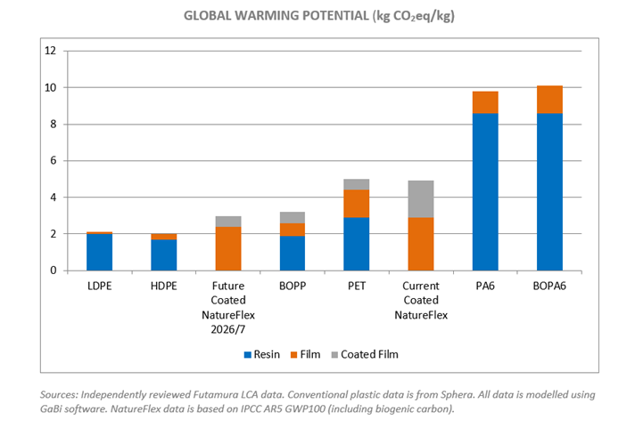 The graph shown below shows the carbon footprint values (kg CO2eq / kg) of various conventional plastic films (polyethylene, polypropylene, polyester and polyamide) together with the current carbon footprint of coated NatureFlex NK film. Also shown on the graph is a predicted carbon footprint for coated NatureFlex in 2027, following planned investments in the manufacturing process.